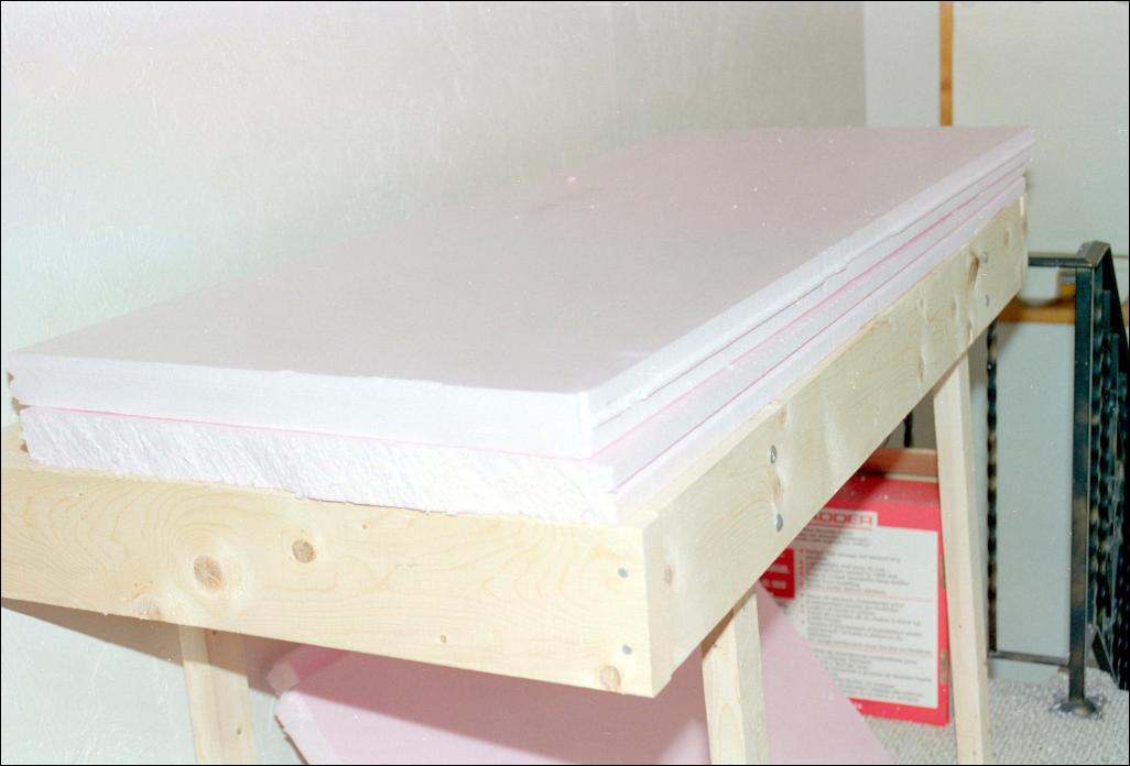 As the first step to building the foam block, the 8' length is cut down to the correct 60" length. The remainder sits under the table.