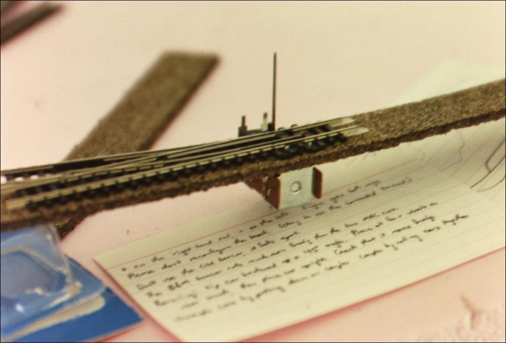 The turnout away from its home. The pins in the switch machine go through corresponding holes in the plastic; to actually mount it with cork roadbed, you need to cut holes in the cork so everything fits together in the right order.