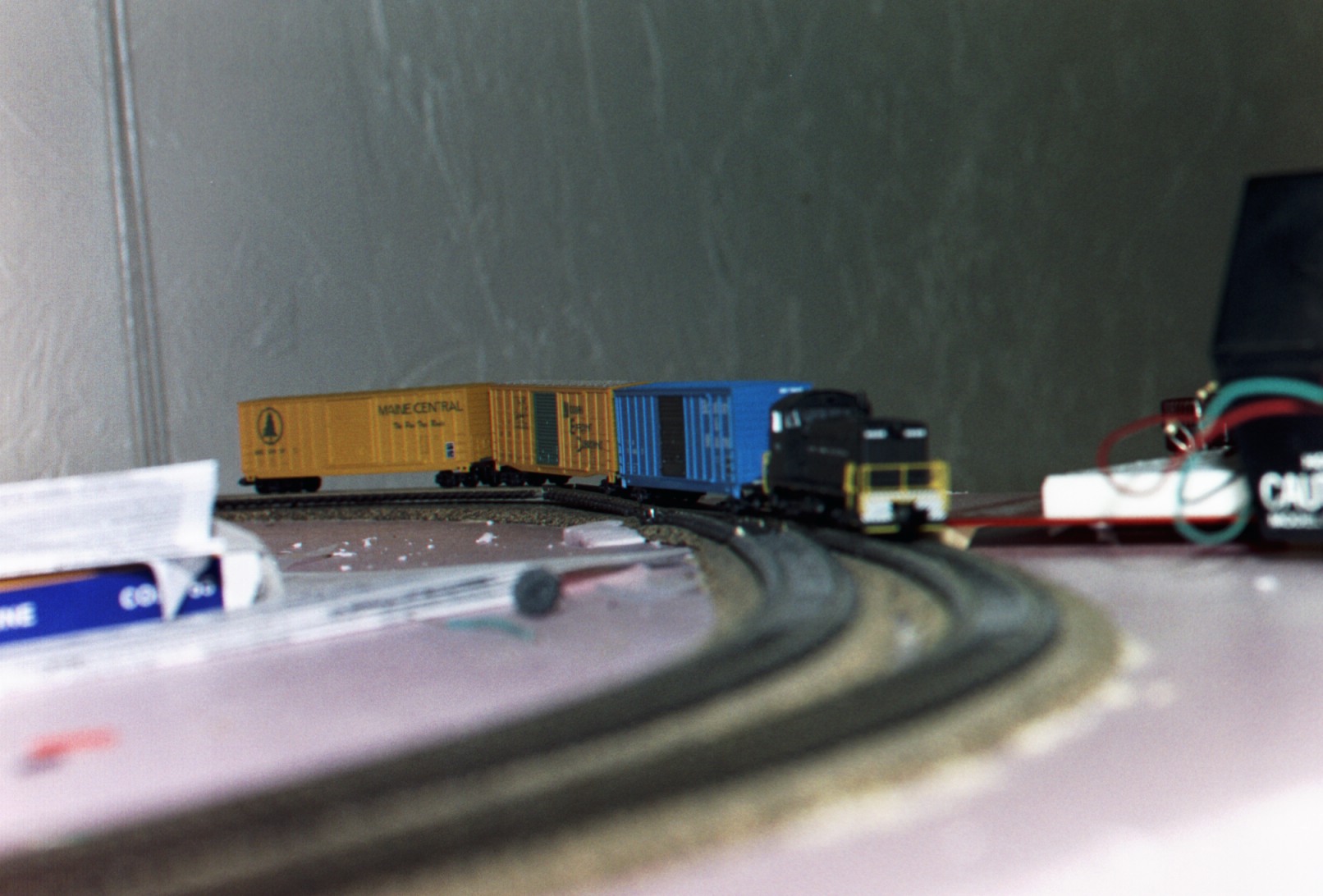 The train pulls around the curve at the right side of the table, taking the outside track.