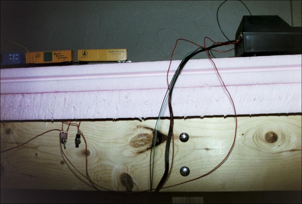 Some of the wiring isn't terribly polished yet. Red wires carry 16VAC; this switch and button control the right-hand switch machine.