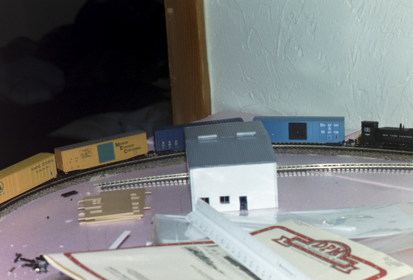 The engine pulling four boxcars behind the building.