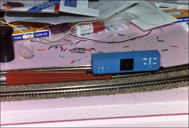 The funny brown piece of plastic actually helps put derailed cars back on to the track. It sits on top of the rails, and has grooves for the wheels, so you can roll the car down it on to the track.