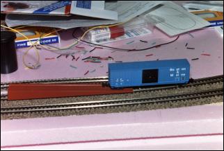 The funny brown piece of plastic actually helps put derailed cars back on to the track. It sits on top of the rails, and has grooves for the wheels, so you can roll the car down it on to the track.