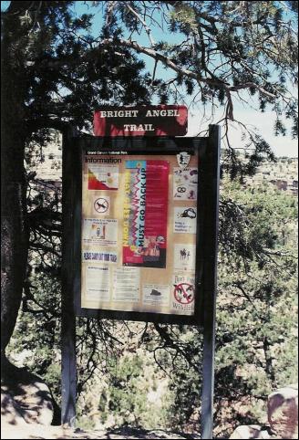Description : Sign at the top of the Bright Angel Trail, leading down into the Grand Canyon. Posters include warnings about packing out your trash, as well as dire warnings about heat: you cannot hike to the bottom of the canyon and back in a single day. A later sign gives recommended endpoints for day hikes, depending on how early you're leaving and how much water you have.
