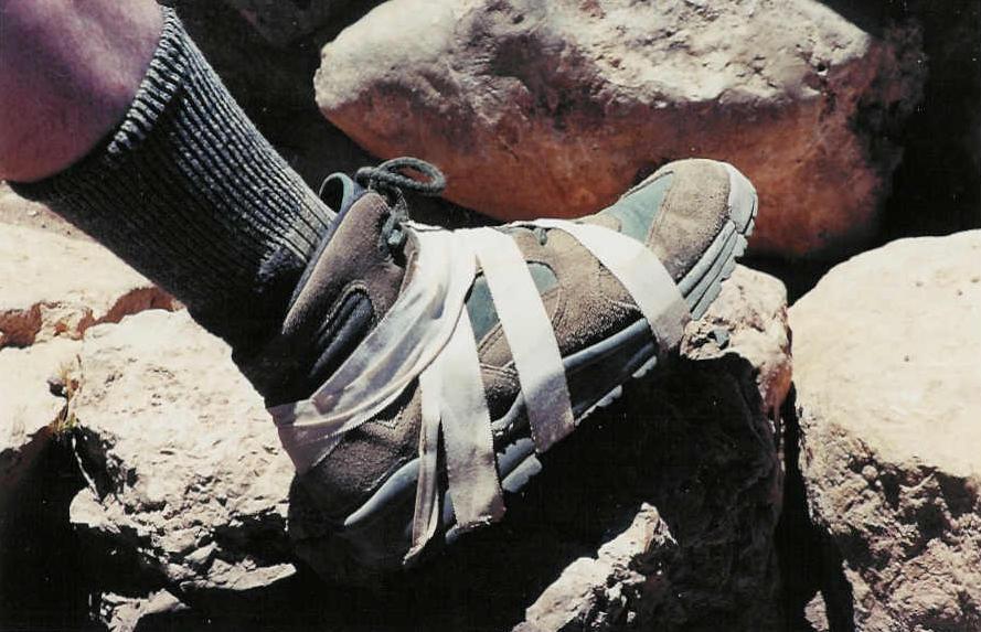 Repairs on a broken shoe. The sole of the shoe was coming off; we used medical tape from a first-aid kit to tape the sole on. This is the "after" picture, after a mile of uphill hiking.