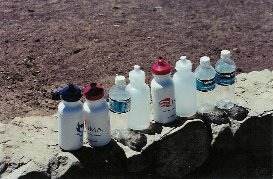 Empty water bottles after the hike. We went as far as the 1 1/2-Mile Resthouse, and then came back up. Going down, three people drank a total of 3 pints of water, then at the bottom, drank two more pints and refilled; this, plus the eight pints here, is a total of 13 pints (a gallon and a half, or about 6.5 liters) for three people for four hours of hiking.