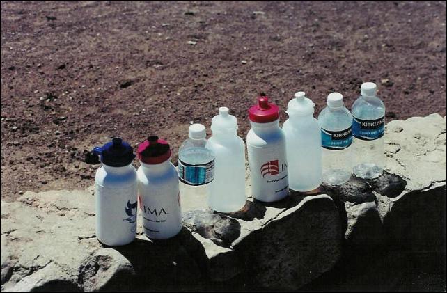 Empty water bottles after the hike. We went as far as the 1 1/2-Mile Resthouse, and then came back up. Going down, three people drank a total of 3 pints of water, then at the bottom, drank two more pints and refilled; this, plus the eight pints here, is a total of 13 pints (a gallon and a half, or about 6.5 liters) for three people for four hours of hiking.