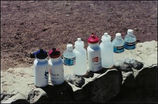 Empty water bottles after the hike. We went as far as the 1 1/2-Mile Resthouse, and then came back up. Going down, three people drank a total of 3 pints of water, then at the bottom, drank two more pints and refilled; this, plus the eight pints here, is a total of 13 pints (a gallon and a half, or about 6.5 liters) for three people for four hours of hiking.