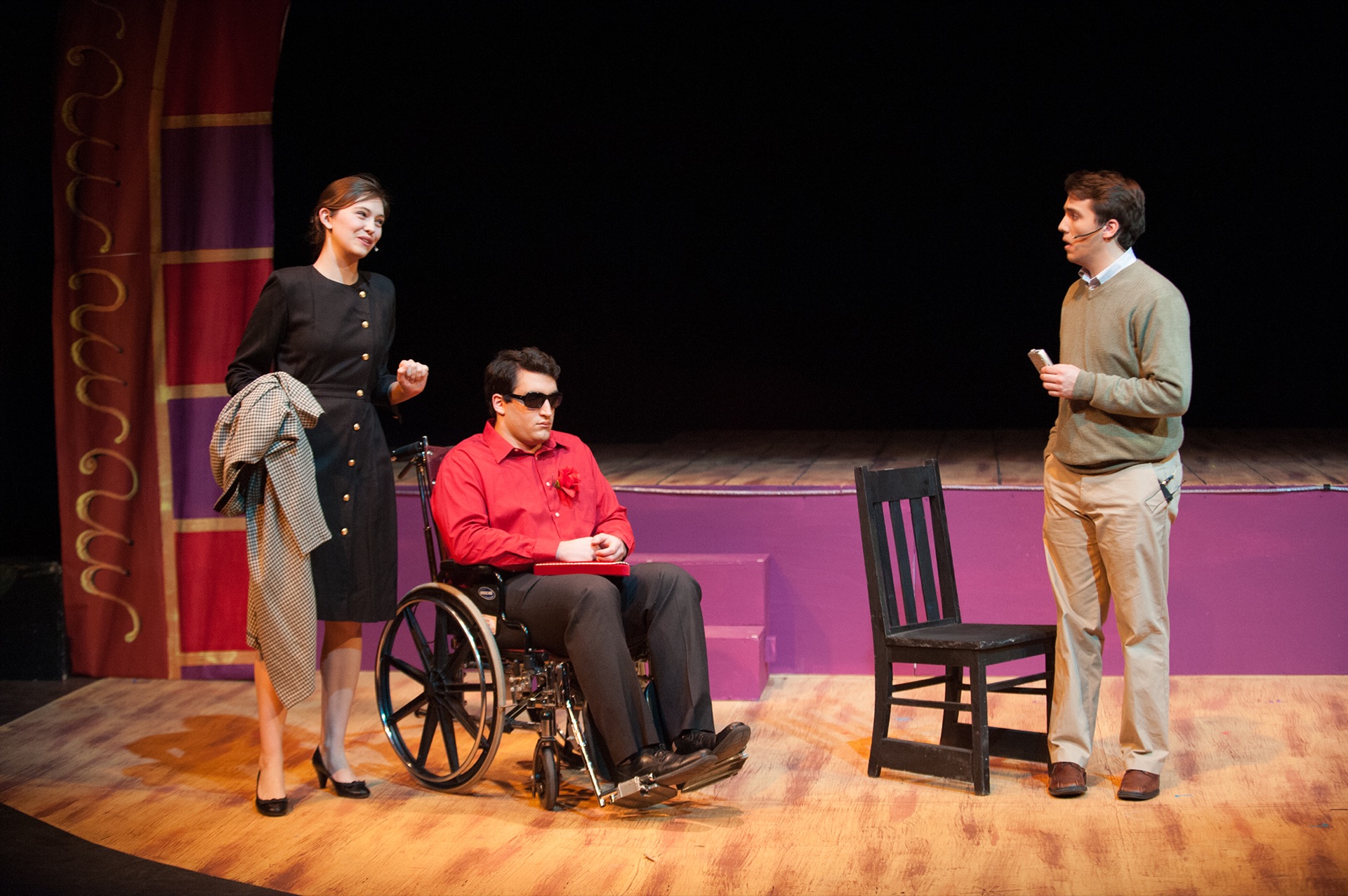 Harry Witherspoon (Michael Greshko G) imagines an exciting vacation away from his dreary shoe store. (credit: Alexander C. Bost) The Solicitor (Rachel McDermott '15) introduces the Body (Matt Iovino '17) to Harry. (credit: Alexander C. Bost) The bellhop (Patience Stevens '16) enthusiastically gives uncle his favorite champagne. (credit: Alexander C. Bost) Rita calls around to local hotels, while Vinnie tries to appease his angry wife. (credit: Alexander C. Bost) Dominique invites the audience to try "Speaking French" with her. (credit: Staly Chin '15) Prosperous Man (Cole Houston '15) and the Croupier (Emily TenCate '15) drag a protesting Vinnie away. (credit: Staly Chin '15) After losing uncle, Harry has a nightmare about returning to his former life. (credit: Staly Chin '15) Dominique and Vinnie enter, guns drawn, and steal the mysterious heart-shaped box. (credit: Alexander C. Bost) |