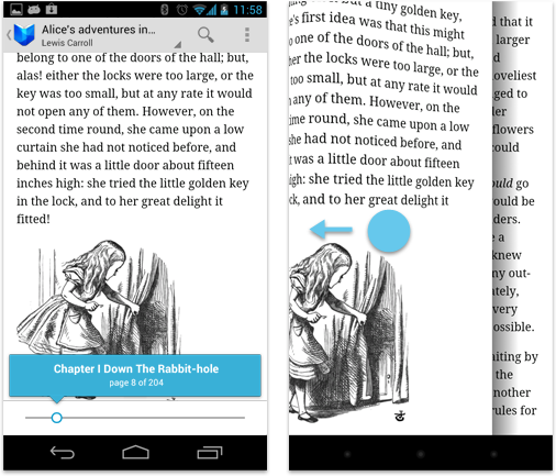 Google Books' detail view replicates the immersive experience of reading an actual book through lights-out mode and a page-flip animation.