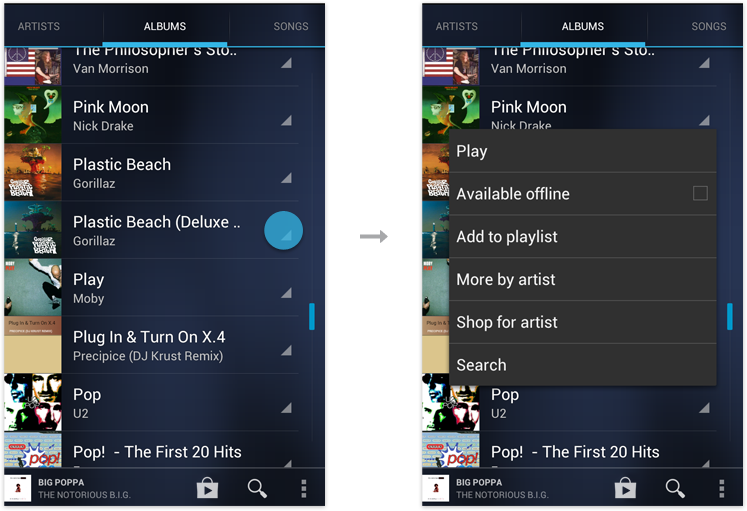 Music allows the user to act upon a data item (song) from within the category view (album), thereby removing the need to navigate all the way down to the song's detail view.