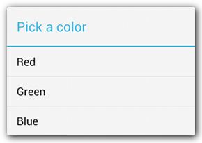 Because the list appears in the dialog's content area, the dialog cannot show both a message and a list and you should set a title for the dialog with setTitle(). To specify the items for the list, call setItems(), passing an array. Alternatively, you can specify a list using setAdapter(). This allows you to back the list with dynamic data (such as from a database) using a ListAdapter.