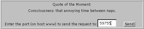Before the applet can get quotes, you need to run the server on the host that the applet came from. You then need to note the number of the port that the server is listening on. After you enter this port number into the applet, it will hook up with the server and you'll be able to get one-line quotations. Below are detailed instructions, followed by pictures of the server and the applet in action.