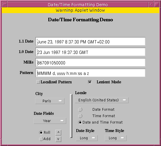 DateFormatto format the data in the millis text box (the date and time when the demo program was first invoked). The Pattern is used to format the date and time. You can control the pattern using the radio buttons and pulldown menus in the lower right of the demo program window.Here's a guide from Taligent that points out interesting things you can do with the demo program. Experiment with the various settings in the demo program according to Taligent's instructions.