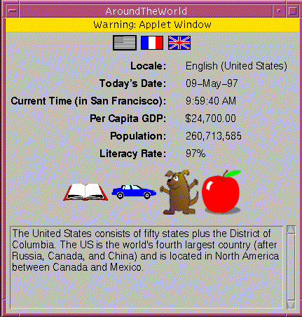 Note: The internationalization features documented in this lesson were added to the JDK for its 1.1 release. Thus theAroundTheWorldapplet will work only in browsers or viewers that support JDK 1.1. If your browser does not support JDK 1.1 applets, you can use theappletviewerprogram that ships with JDK 1.1 to run the program. Or you can run it as a stand-alone program using the 1.1javainterpreter.
