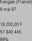 Here's the listing ofNumbersBundle, aListResourceBundlethat contains the data for the GDP, population, and literacy rate.As with the other resource bundles that we've looked at so far,import java.util.ListResourceBundle; public class NumbersBundle extends ListResourceBundle { public Object[][] getContents() { return contents; } static final Object[][] contents = { // LOCALIZE THIS { "GDP", new Double(24700) }, { "Population", new Integer(260713585) }, { "Literacy", new Double(0.97) }, // END "LOCALIZE THIS" }; }NumbersBundleis the default bundle and contains the data for the United States locale. Notice that where the other bundles had strings,NumbersBundlecreatesDoubleandIntegerobjects. Any kind of object can be stored in a resource bundle. To retrieve them, you use thegetObjectmethod provided by theResourceBundleclass. This is the code that LinguaPanel uses to get the GDP, population, and literacy rate fromNumbersBundle:Note that the object returned fromgdp = (Double) numbers.getObject("GDP"); . . . population = (Integer) numbers.getObject("Population"); . . . literacy = (Double) numbers.getObject("Literacy");getObjectis an Object and may need to be cast to the correct type. In the previous example,gdpandliteracyare bothDoubles andpopulationis anInteger. Thus the value returned fromgetObjectis appropriately cast in each statement.The numbers data are displayed next to the text labels in the LinguaPanel. The following is a snapshot of the data for the France locale: