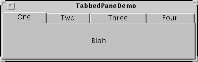 TabbedPaneDemo.javathat creates the tabbed pane in the previous example. Note that no event-handling code is necessary. TheJTabbedPaneobject takes care of handling user input for you.The following tables list the commonly usedJTabbedPane tabbedPane = new JTabbedPane(); Component panel1 = makeTextPanel("Blah"); tabbedPane.addTab("One", null, panel1, "Does nothing"); tabbedPane.setSelectedIndex(0); Component panel2 = makeTextPanel("Blah blah"); tabbedPane.addTab("Two", null, panel2, "Does nothing"); Component panel3 = makeTextPanel("Blah blah blah"); tabbedPane.addTab("Three", null, panel3, "Does nothing"); Component panel4 = makeTextPanel("Blah blah blah blah"); tabbedPane.addTab("Four", null, panel4, "Does nothing"); . . . add(tabbedPane);JTabbedPanemethods and constructors.[PENDING: add API tables]