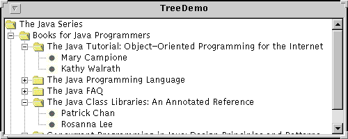 TreeDemo.javathat implements the tree in the previous example.[API discussion to follow. Discuss renderer options.]//In initialization code in aJPanelsubclass: //Create the nodes. TreeNode top = new TreeNode("The Java Series"); TreeNode category; TreeNode book; category = new TreeNode("Books for Java Programmers"); top.add(category); //Tutorial book = new TreeNode("The Java Tutorial: Object-Oriented Programming for the Internet"); book.add(new TreeNode("Mary Campione")); book.add(new TreeNode("Kathy Walrath")); category.add(book); ...//Do the same for each book in the category... category = new TreeNode("Books for Java Implementers"); top.add(category); //VM book = new TreeNode("The Java Virtual Machine Specification"); book.add(new TreeNode("Tim Lindholm")); book.add(new TreeNode("Frank Yellin")); category.add(book); ...//Do the same for each book in the category... //Make all child-free nodes leaves. makeLeaves(top); JTree tree = new JTree(top); . . . //This method will be added to the TreeNode API in a future release. protected void makeLeaves(TreeNode top) { Enumeration childEnum = top.preorderEnumeration(); TreeNode descendant; while(childEnum.hasMoreElements()) { descendant = (TreeNode)childEnum.nextElement(); if(descendant.getChildCount() == 0) descendant.setAllowsChildren(false); } }