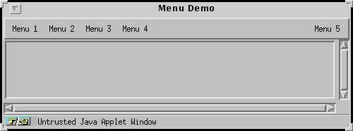 The following applet shows many of the menu features you're likely to use. The window it brings up has a menu bar that contains five menus. Each menu contains one or more items. Menu 1 is a tear-off menu; by clicking the dashed line, the user creates a new window that contains the same menu items as Menu 1. (Currently, tear-off menus are implemented only on the Solaris platform, not in Windows 95/NT or MacOS.) Menu 2's only item has a checkbox. Menu 3 contains a separator between its second and third items. Menu 4 contains a submenu. Menu 5 is the window's help menu, which (depending on the platform) generally means that it's set off to the right. When the user clicks on any menu item, the window displays a string indicating which item was clicked and what menu it's in.
