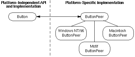 The AWT was designed from the start to have a platform-independent API and yet to preserve each platform's look and feel. For example, the AWT has just one API for buttons (provided by the Button class), but a button looks different on a Macintosh than on a PC running Windows 95.The AWT achieves its seemingly contradictory goals by providing classes (components) that provide a platform-independent API but that make use of platform-specific implementations (peers). To be specific, every AWT component class (Component, MenuComponent, and their subclasses) has an equivalent peer class, and every component object has a peer object that controls the object's look and feel.