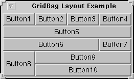 GridBagLayout is the most sophisticated, flexible layout manager the AWT provides. It aligns components by placing them within a grid of cells, allowing some components to span more than one cell. The rows in the grid aren't necessarily all the same height; similarly, grid columns can have different widths. Here's an applet that uses a GridBagLayout to manage ten buttons in a panel.