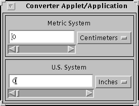 The program converts distance measurements between metric and U.S. units. Here, for the curious, is its source code. We do not expect you to fully understand the source code without reading the rest of this lesson and the relevant pages in the Using Components, the GUI Building Blocks(in the Creating a User Interface trail) and Laying Out Components within a Container(in the Creating a User Interface trail) lessons. Below is the program, running as an applet.
