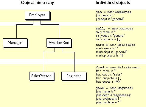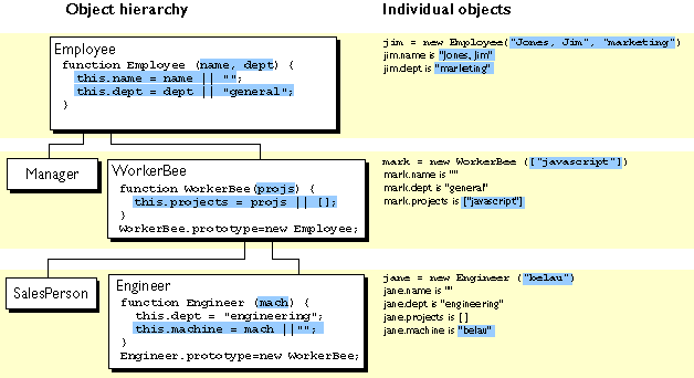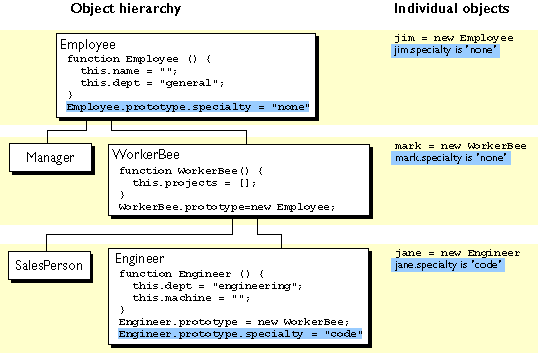 Engineer and SalesPerson definitions create objects that descend from WorkerBee and hence from Employee. An object of these types has properties of all the objects above it in the chain. In addition, these definitions override the inherited value of the dept property with new values specific to these objects.