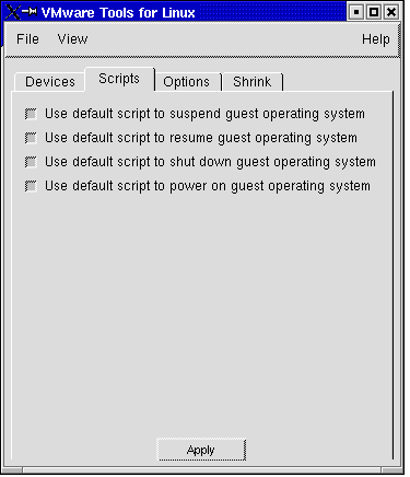 A default script for each power operation is included in VMware Tools. These scripts are located in the guest operating system in /etc/vmware-tools.