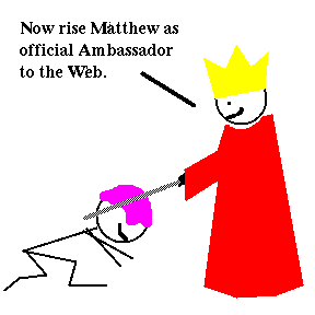 Actually there were no swords or anything because it was over the phone. Really. Matthew and Jake are thinking of renaming this to "Matthew, Moxy Fruvous Ambassador to the Internet and Jake, Moxy Fruvous Cultural Attache, Adventures". Matthew and Jake have stopped thinking of this. Oh, by the way, Jake is Cultural Attache. Really.