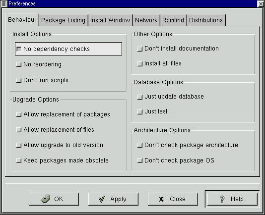 Under the Behavior tab, you'll find a number of options for configuring the way Gnome-RPM installs, uninstalls and upgrades packages. The Behavior tab is split into five sections: Install, Upgrade, Other, Database and Architecture. Note that by default these boxes are not checked (see Figure 7-5).
