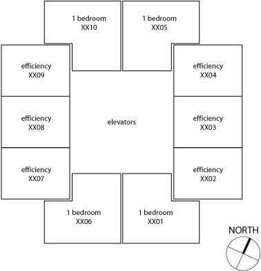 Each floor of the high-rise building has ten apartments: the Eastern and Western sides of the building each have three efficiency apartments, and the Northern and Southern sides each have two one bedroom apartments.