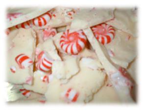 In a microwavable bowl, melt dark chocolate.  Use the directions on the back of the bag, but usually a minute will do it.  Pour dark chocolate onto a baking pan lined with waxed paper.  Sprinkle peppermints on top, and let harden for about 15 minutes.  Meanwhile, melt the white chocolate; start with 30 seconds because it tends to dry out.  Pour white chocolate on top of the dark, and freeze until firm.  Remove from pan, and break into bite sized pieces.