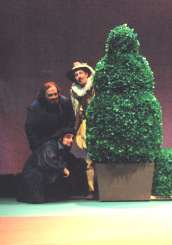 Toby, Andrew, and Fabian hide in the garden to listen in on Malvolio |