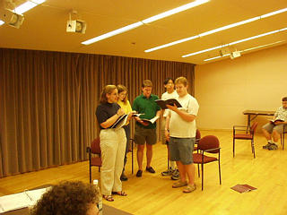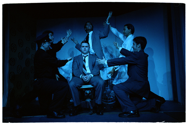 Jimmy Powers (Greg Pollock, center) and the Angel City 4 (Beth Siers, Caitlin Marlow, Brian Wong, David Zych), in rehearsal