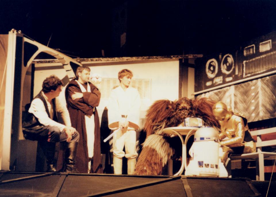 Han Solo (Jamez Kirtley '94), Obi-Wan Kenobi (David Jedlinksy '89), Luke Skywalker (Todd Radford G), Chewbacca (Derek Herrera '92), C-3PO (Eleanor Pritchard '06), and R2-D2 in the Millenium Falcon. (credit: Jax Kirtley) |