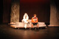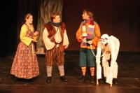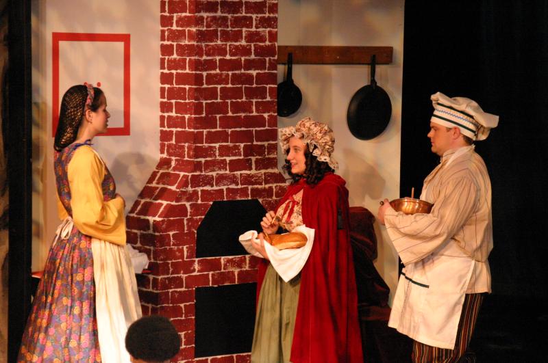 The Baker's Wife (Caitlin Marlow), Red Ridinghood (Miranda Knutson) and the Baker (Pete Chambers) discuss an upcoming trip to the Woods (credit: Jax Kirtley) The Baker (Pete Chambers) treads cautiously when approached by the Witch (Welkin Pope) (credit: Jax Kirtley) In Grandmother's cottage, Red Ridinghood (Miranda Knutson, standing) examines what a big wet mouth the Wolf (Rogue Shindler) has (credit: Jax Kirtley) Milky-White the Cow (Steven Flowers) (credit: Jax Kirtley) The Baker (Pete Chambers) visits Jack's Mother (Tanis O'Connor), Jack (Todd Radford), and their cow (Steven Flowers) (credit: Jax Kirtley) The Baker, Red Ridinghood, Cinderella, and Jack (Pete Chambers, Miranda Knutson, Nori Pritchard, Todd Radford) blame the Witch (Welkin Pope) (credit: Jax Kirtley) The Witch (Welkin Pope) (credit: Jax Kirtley) |