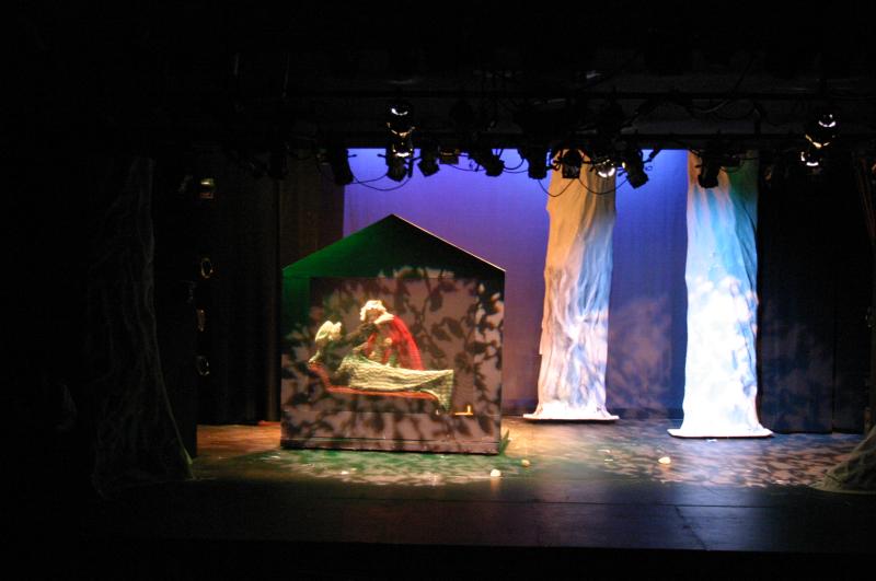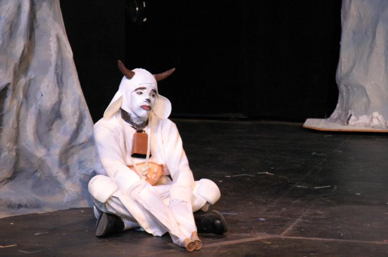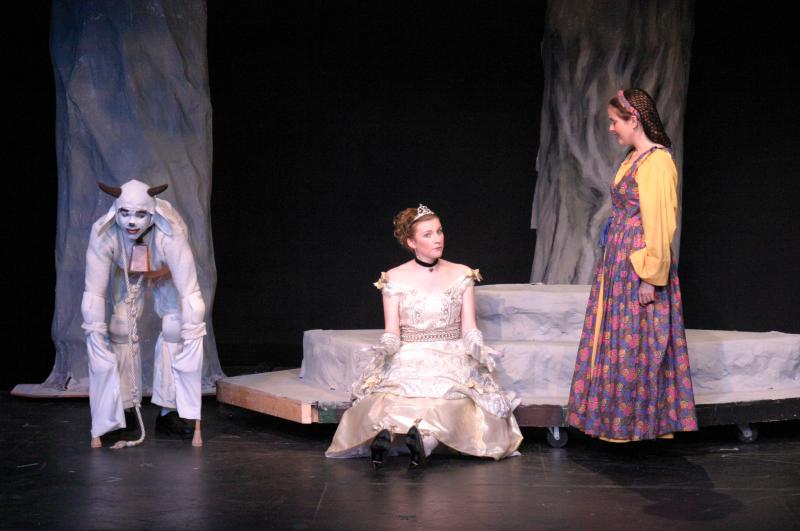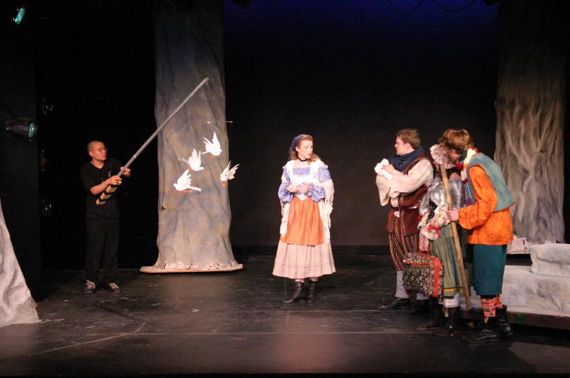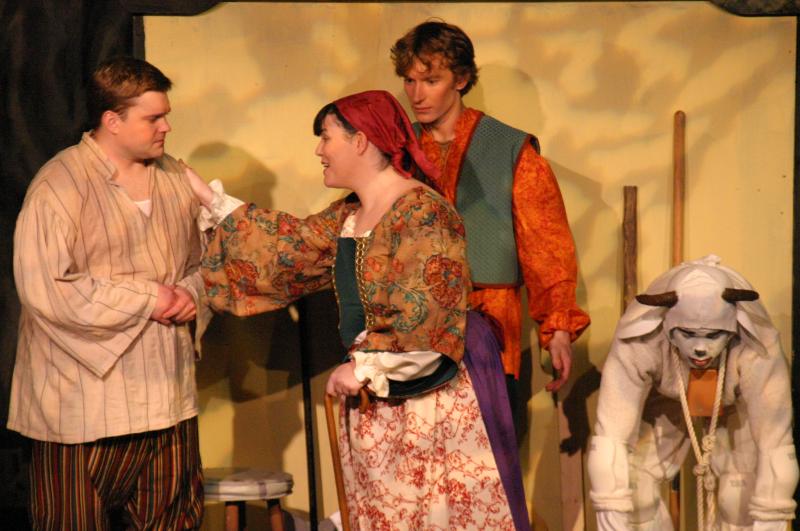 Milky-White (Steven Flowers) and Jack (Todd Radford) rest before market (credit: Jax Kirtley) The Baker and his Wife (Caitlin Marlow, Pete Chambers) convince Jack (Todd Radford) to sell his cow (Steven Flowers) (credit: Jax Kirtley) The cow (Steven Flowers) waits patiently while Cinderella and the Baker's Wife (Nori Pritchard and Caitlin Marlow) discuss the virtues of princes (credit: Jax Kirtley) Cinderella (Nori Pritchard) (credit: Jax Kirtley) The Princes (Jesse Cox, Rogue Shindler) extol the virtues of `Agony' (credit: Jax Kirtley) Cinderella (Nori Pritchard, center) explains to the others how she talks to birds (controlled by Ken Takusagawa, left) (credit: Jax Kirtley) The Baker (Pete Chambers) comforts his child (credit: Jax Kirtley) |