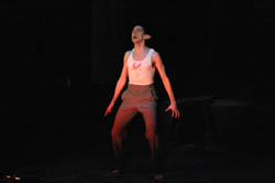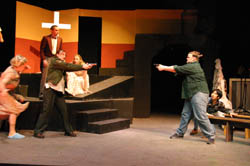 The Deputy (Joe Lowery, left) and Sheriff (Welkin Pope, green jacket) hand the Bat Boy (David Poland, in bag) to Shelley (Nori Pritchard) and Meredith (ML Peters, right). (credit: Jax Kirtley) Dr. Parker (Paul Giragos) reminisces with Meredith (ML Peters). (credit: Jax Kirtley) Meredith (ML Peters) teaches Edgar the Bat Boy (David Poland) to read. (credit: Jax Kirtley) The townspeople make "A Joyful Noise". (credit: Jax Kirtley) Dawn Erickson and Todd Radford take their vicious hunting dogs Muffin (as herself) and Mr. Princess Snugglebutt (Siris) on a hunt for the Bat Boy. (credit: Jax Kirtley) Edgar (David Poland) makes an "Apology to a Cow". (credit: Jax Kirtley) Shelley (Nori Pritchard, kneeling) comforts Edgar (David Poland) after the death of her parents. (credit: Jax Kirtley) DZ and the Joyful Noiz! (Jeremy Nimmer, Stephen Peters, Dennis Miaw, Sue Swalley, David Zych) (credit: Jax Kirtley) "Children, Children", with Pan (Joe Lowery, up center), Shelley and Edgar (Nori Pritchard and David Poland, center), surrounded by helpful forest creatures. And a lobster. (credit: Jax Kirtley) |