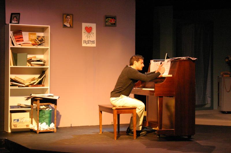 Gordon (Paul Giragos) works on his next song. (credit: Jax Kirtley) Gordon (Paul Giragos) and his mother (Heather Doering '05) (credit: Jax Kirtley) Gordon (Paul Giragos) and Roger (Kenny Kamrin G) (credit: Jax Kirtley) Gordon (Paul Giragos) listens to Mr. Bungee (David Poland '04) (credit: Jax Kirtley) |