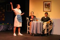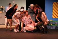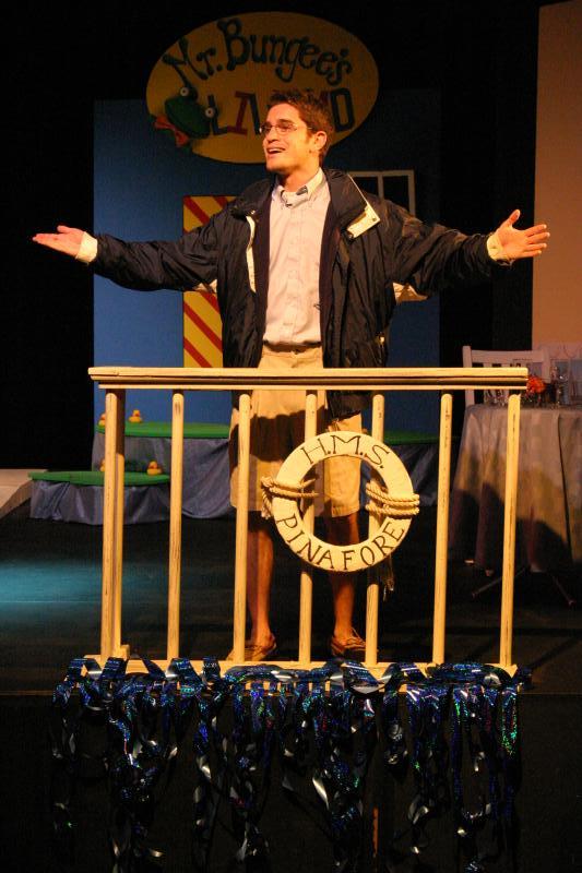 The waitress (Nicolina Akraboff '07) extols the virtue of "Calamari" to Rhoda (Cinda Lavely) and Gordon (Paul Giragos) (credit: Jax Kirtley) Roger (Kenny Kamrin G) would rather be "Sailing" (credit: Jax Kirtley) "Sitting in the Lee of Cuttyhunk" (left to right): Kenny Kamrin G, TR Jordan '07 (front), Mike Rolish '04 (back), Jennifer Braun '02, Heather Doering '05 (back), Arthur Fitzmaurice '03/SM'04, Cinda Lavely, Paul Giragos, Nicolina Akraboff '07 (credit: Jax Kirtley) |