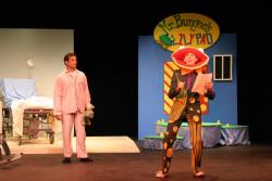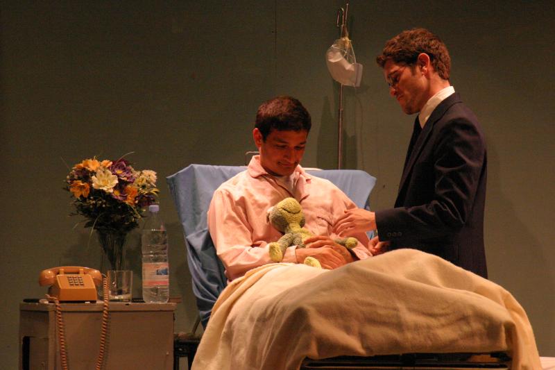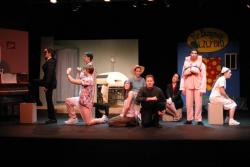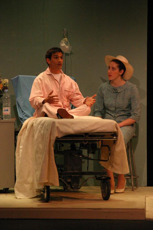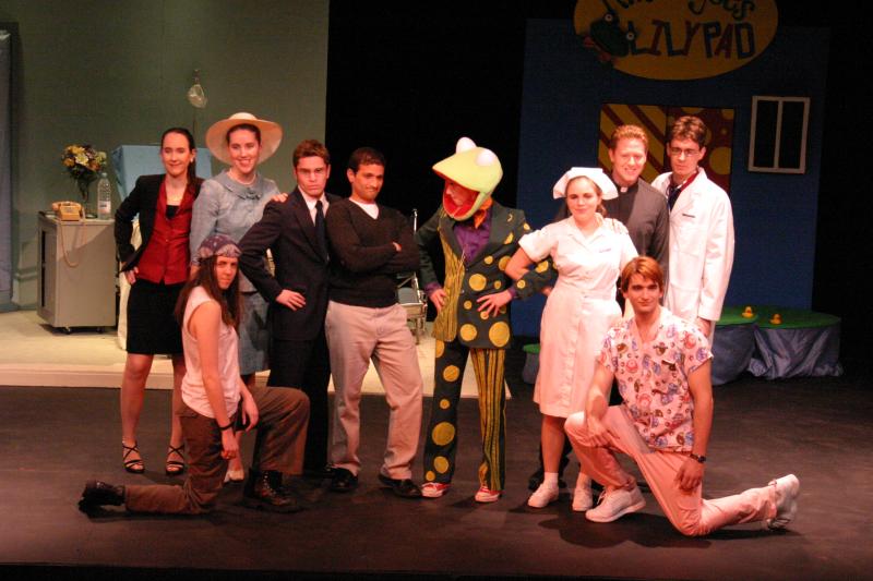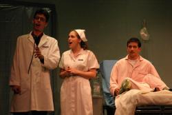 Cast photo (left to right): Cinda Lavely, Jennifer Braun '02 (kneeling), Heather Doering '05, Kenny Kamrin G, Paul Giragos, David Poland '04, Nicolina Akraboff '07, Arthur Fitzmaurice '03/SM'04, TR Jordan '07 (kneeling), Mike Rolish '04 (credit: Jax Kirtley) "Gordo's Law of Genetics" (left to right): Paul Giragos (background, in bed), Cinda Lavely, Nicolina Akraboff '07, Mike Rolish '04 (behind Nikki), TR Jordan '07 (kneeling), Heather Doering '05, Arthur Fitzmaurice '03/SM'04, Jennifer Braun '02. (credit: Jax Kirtley) Dr. Berensteiner (Mike Rolish '04) and Nurse Nancy (Nicolina Akraboff '07) discuss the prognosis for Gordon (Paul Giragos) (credit: Jax Kirtley) |