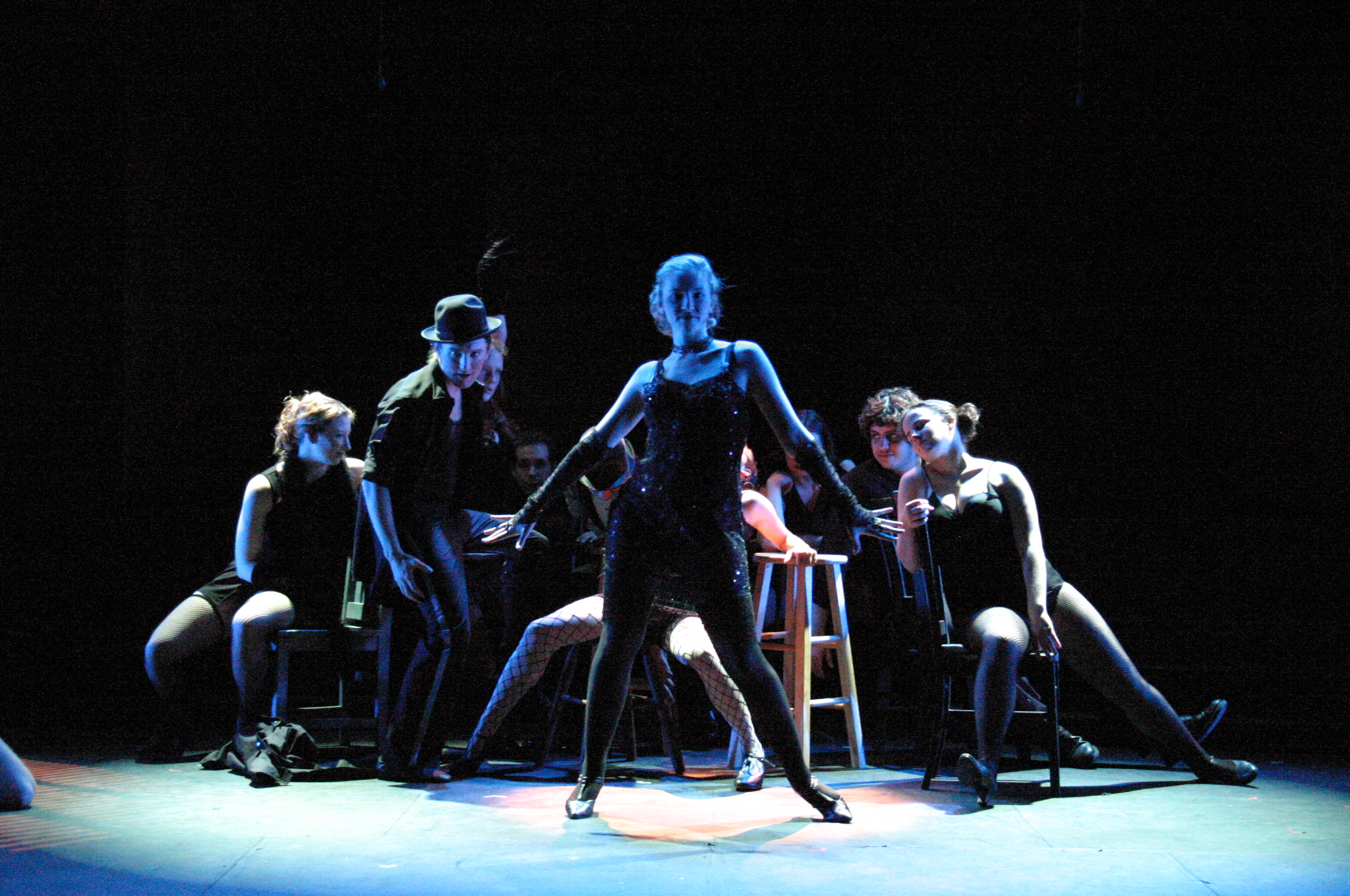 Velma Kelley (Nori Pritchard) in "All That Jazz" (credit: Jax Kirtley) "Number 17 -- The Spread Eagle": Sally Peach, Matt Stern, and Nori Pritchard (credit: Jax Kirtley) "All I Care About is Love": Billy Flynn (Matthew Ciborowski) surrounded by his chorus (Gabrielle Abousleman, Nikki Akraboff, Sally Peach, Amanda Giermann, Kelsey Contreras, Amelia Thomas, Dawn Erickson, Krista Sergi) (credit: Jax Kirtley) Roxie and her crack medical team of doctors and nurses (from left: Milo Martinez, J. Michael Spencer, Isa de Castro, Matt Maranda, Carlos Cardenas, Edmund Golaski) in "My Baby and Me" (credit: Jax Kirtley) "Razzle Dazzle" (credit: Jax Kirtley) Velma and Mama (Nori Pritchard and Michelle Fogerson) listen to Roxie's trial and comment on the lack of "Class" (credit: Jax Kirtley) |
