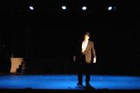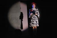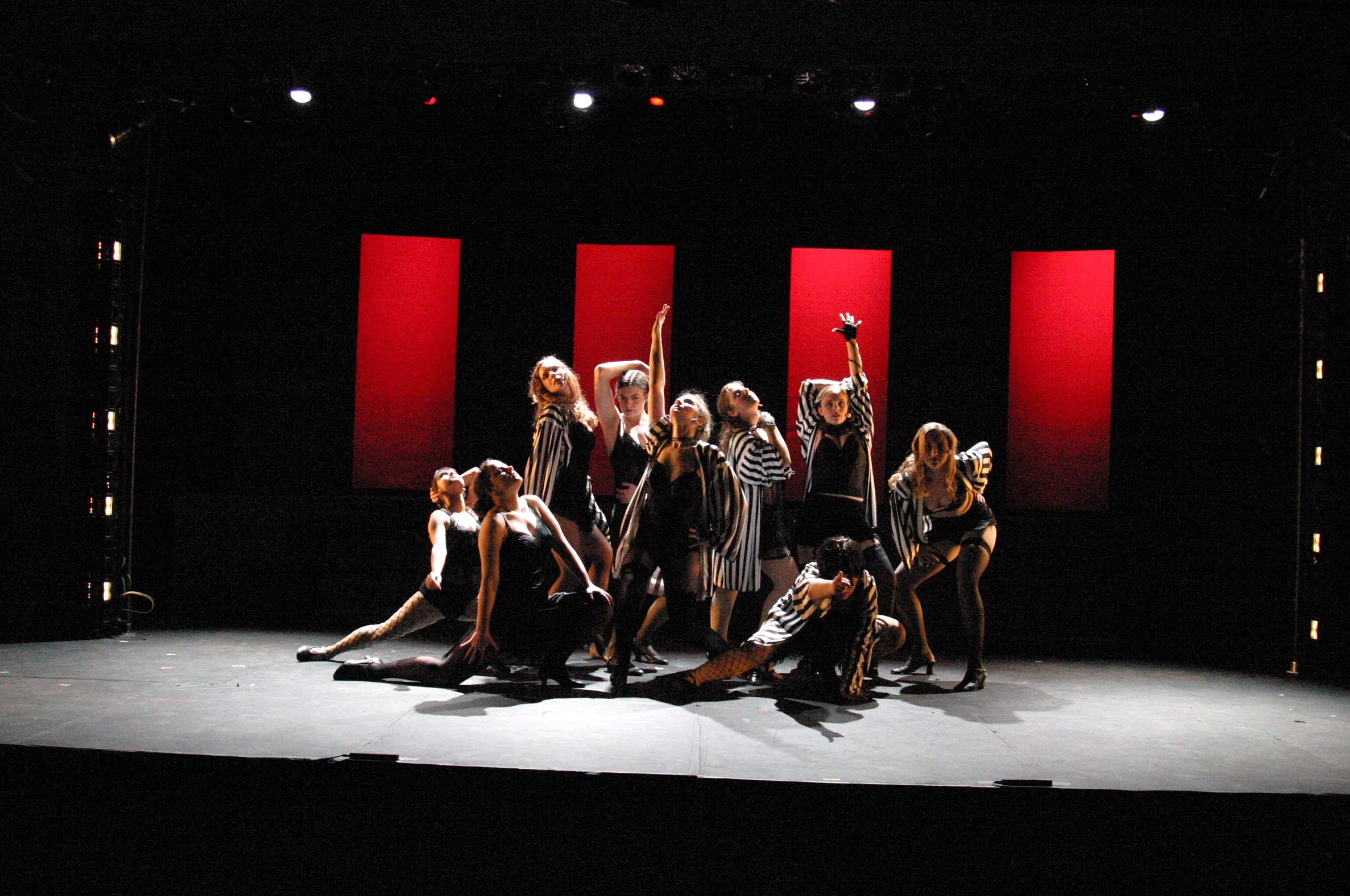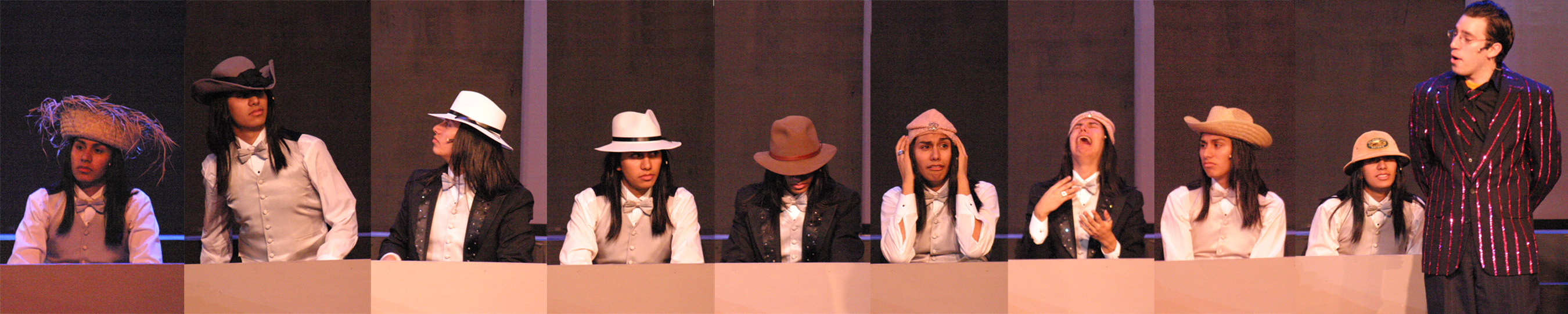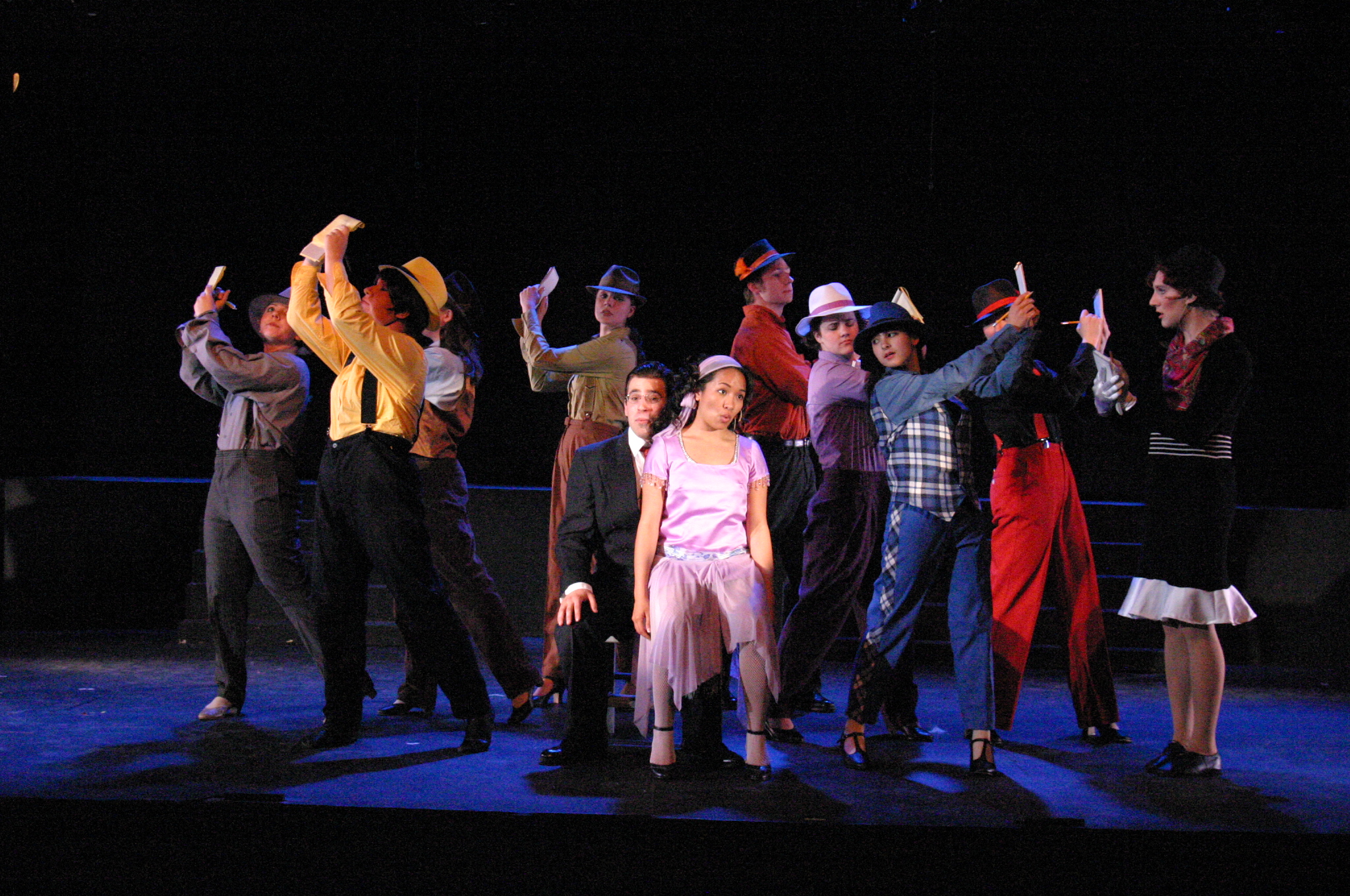 Murderess Anne (Amelia Thomas, right) describes her unfaithful husband (Milo Martinez) in the "Cell Block Tango" (credit: Jax Kirtley) "Cell Block Tango": Gabrielle Abousleman, Sally Peach, Kelsey Contreras, Amanda Giermann, Nori Pritchard, Krista Sergi, Nikki Akraboff, Dawn Erickson, Amelia Thomas (credit: Jax Kirtley) Billy and Roxie (Matthew Ciborowski, Isa de Castro, center) hold a press conference in "Both Reached for the Gun" (credit: Jax Kirtley) Amos (Greg Lohman) is "Mister Cellophane" (credit: Jax Kirtley) The audience of reporters at Roxie's trial (from left: Krista Sergi, Nikki Akraboff, Sally Peach, Thom Dancy, J. Michael Spencer, Dawn Erickson) (credit: Jax Kirtley) Mary Sunshine (Thom Dancy) (credit: Jax Kirtley) |