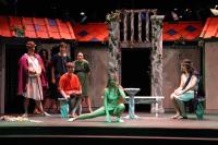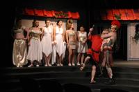 The courtesans (Janet Lieberman '07, Tara Jewett, Shannon Nees '07, Aparna Ramanathan '07, Sarah Slotznick '09, and Theresa Eugenio '07) watch Miles Glorious (Misha Leybovich G) give Pseudolus (Tim Abrahamsen '06) an emphatic hello. (credit: Jax Kirtley)