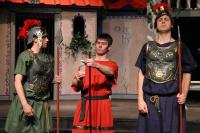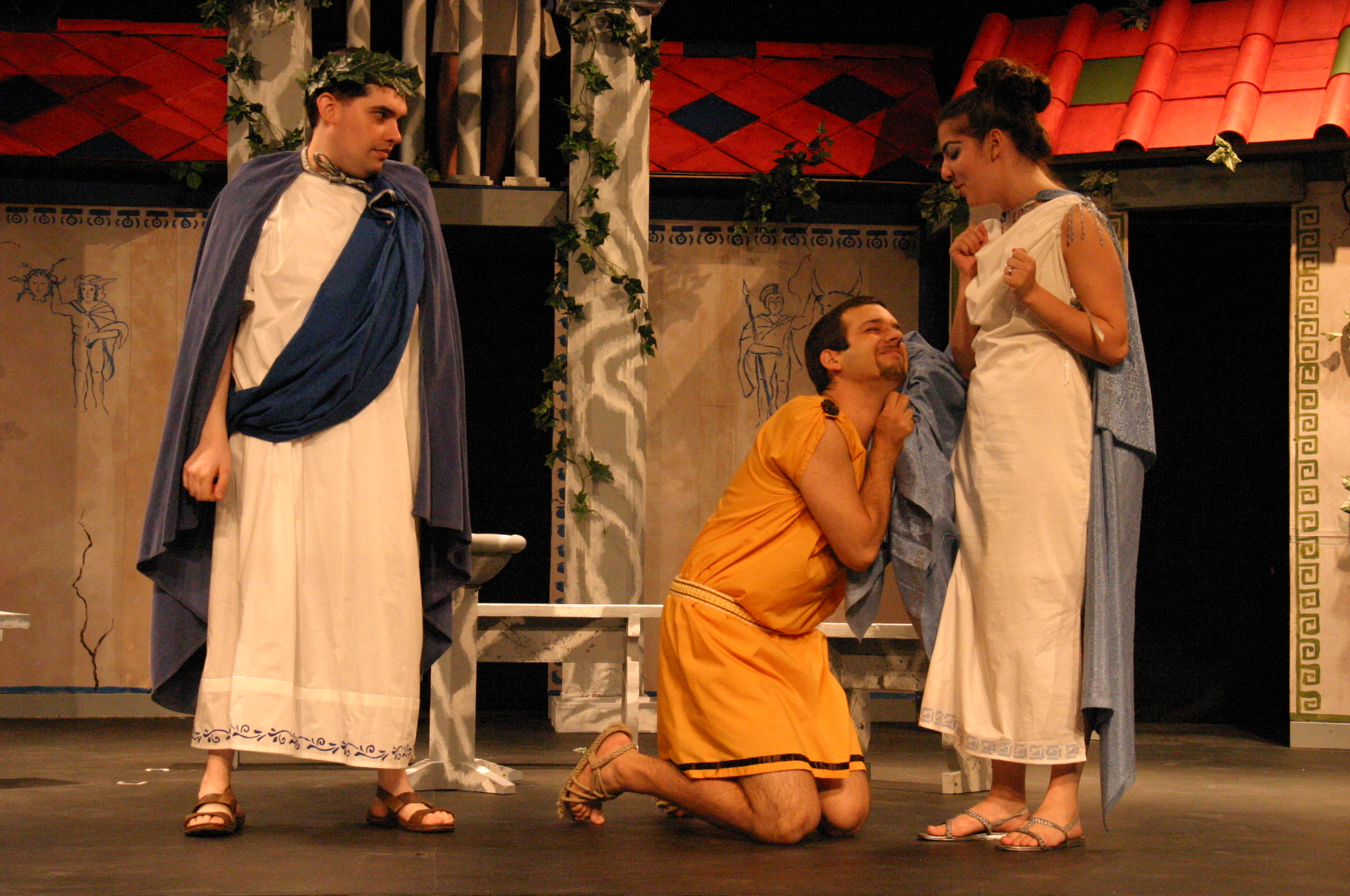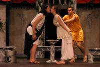 Senex (Greg Lohman G), Pseudolus (Tim Abrahamsen '06), and Hysterium (Daniel Perez '10) declare that 'Everybody Ought to Have a Maid' (credit: Jax Kirtley)