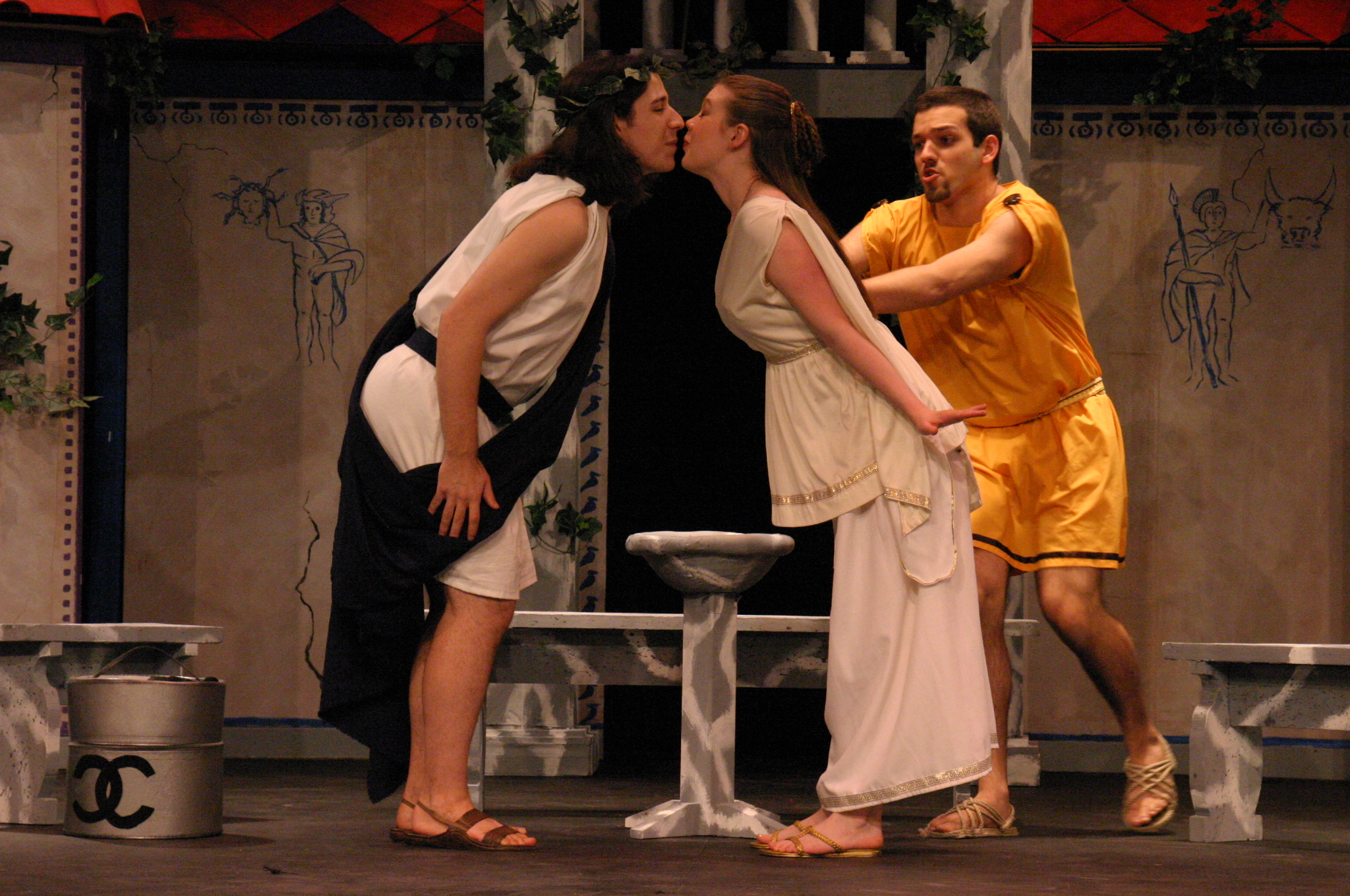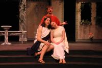 Young lovers Hero (Yonatan Arie Gray '10) and Philia (Kathleen McEnnis '07) are interrupted by Slave-in-Chief, Hysterium (Daniel Perez '10). (credit: Jax Kirtley)