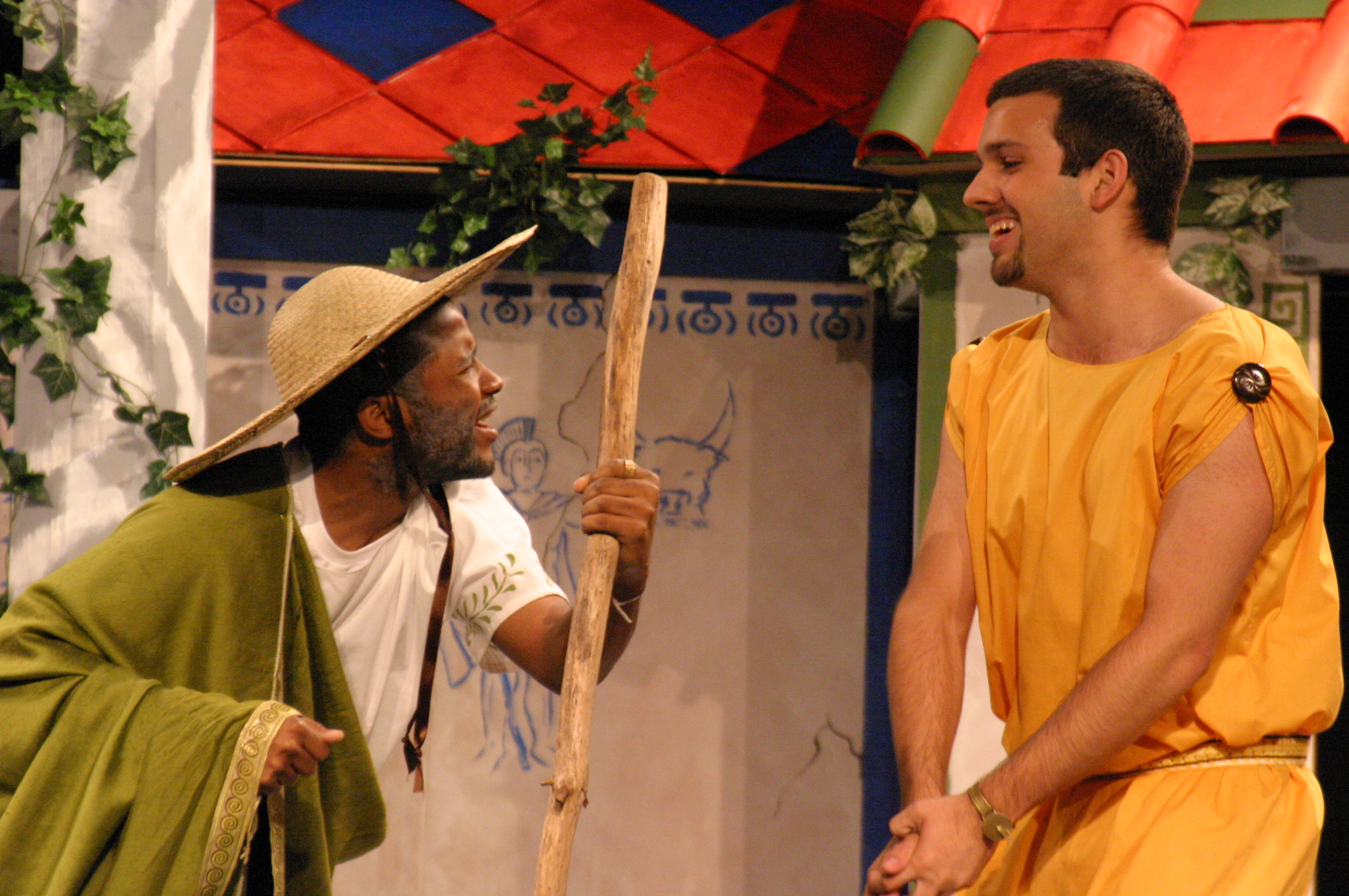 Hero (Yonatan Arie Gray '10) and Pseudolus (Tim Abrahamsen '06) discuss love and freedom. (credit: Jax Kirtley)