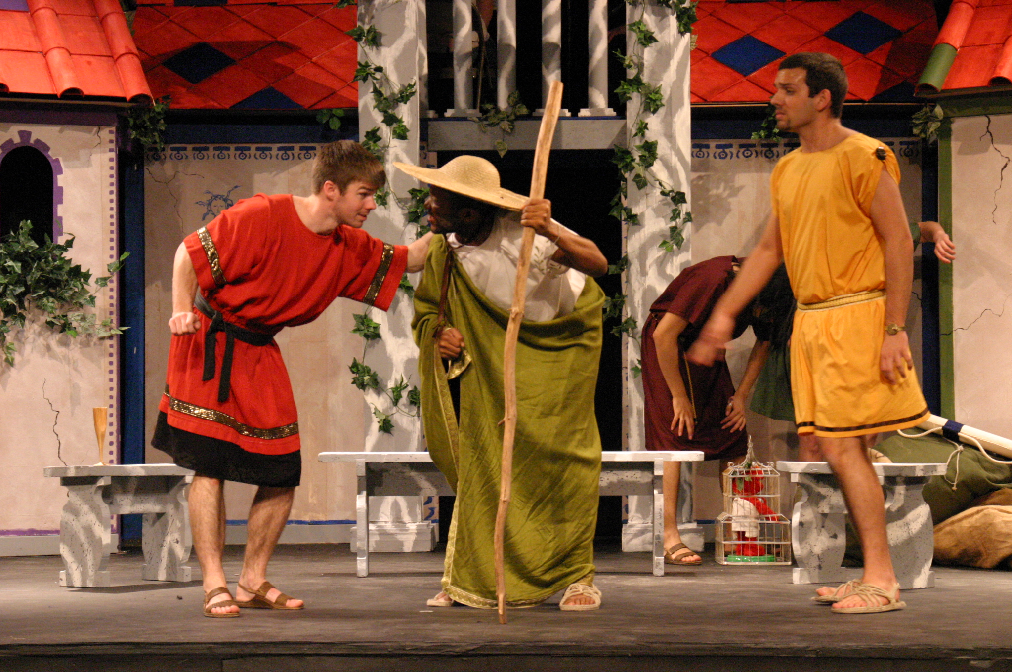 Erronius (Steven Flowers '06) is kept from his house by Hysterium (Daniel Perez '10). (credit: Jax Kirtley)