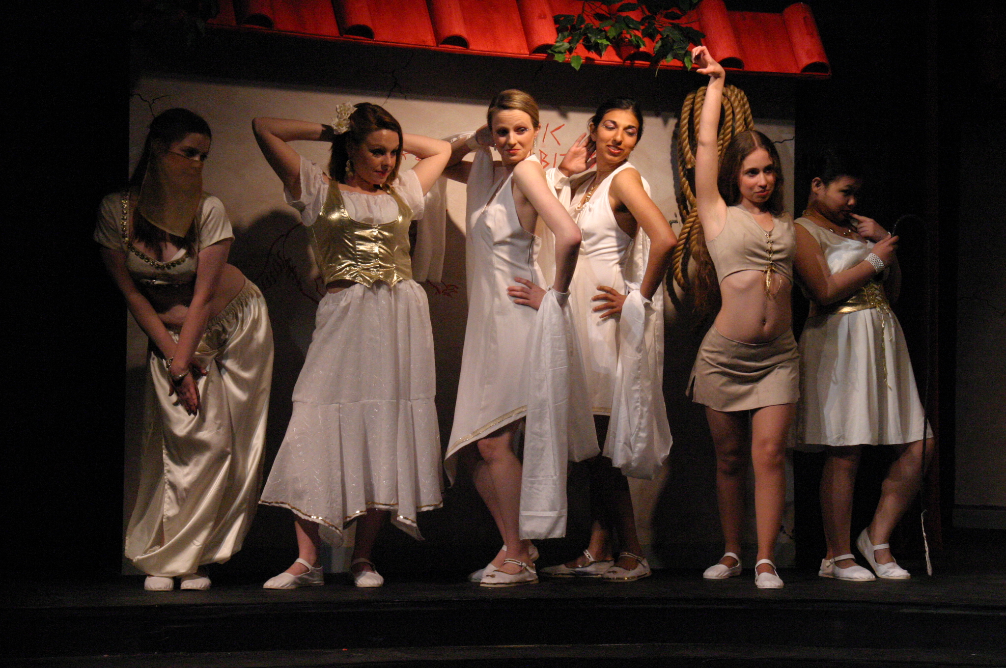 The courtesans (Janet Lieberman '07, Tara Jewett, Shannon Nees '07, Aparna Ramanathan '07, Sarah Slotznick '09, and Theresa Eugenio '07) strike a professional pose. (credit: Jax Kirtley)