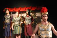 Milos Gloriousus (Misha Leybovich G) and his Soldiers (Armen Babikyan, Nicole O'Keefe '09, and Milo Martinez '08) introduce Miles Gloriousus. (credit: Jax Kirtley)